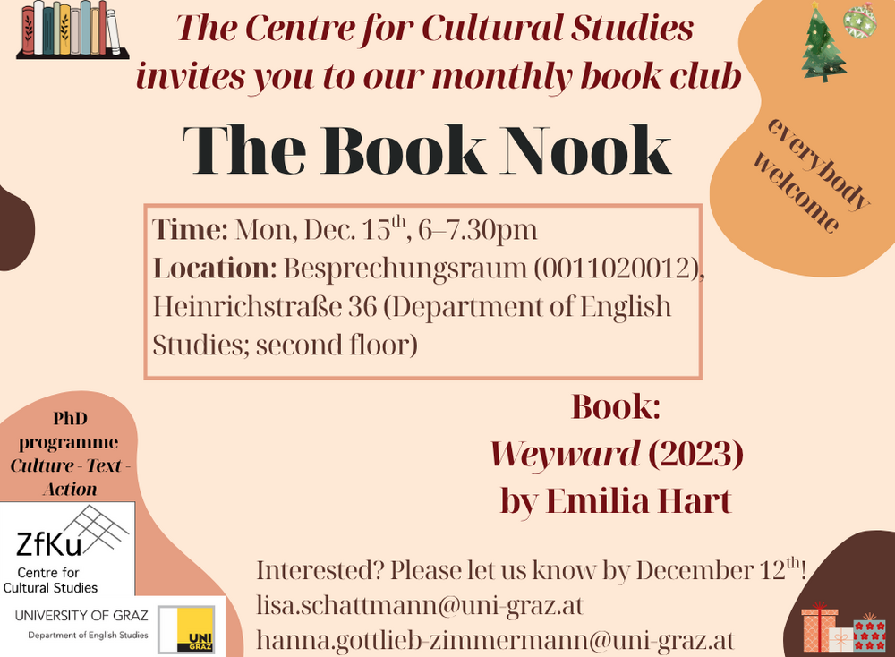 The Centre for Cultural Studies is happy to invite you to our monthly book club, “The Book Nook,” starting on November 17th! Organised by two PhD students of the PhDNet Literary and Cultural Studies, Hanna Gottlieb-Zimmermann and Lisa Schattmann, the Book Club is specifically designed to create a space for discussing a variety of books, ranging from classics to contemporary literature.